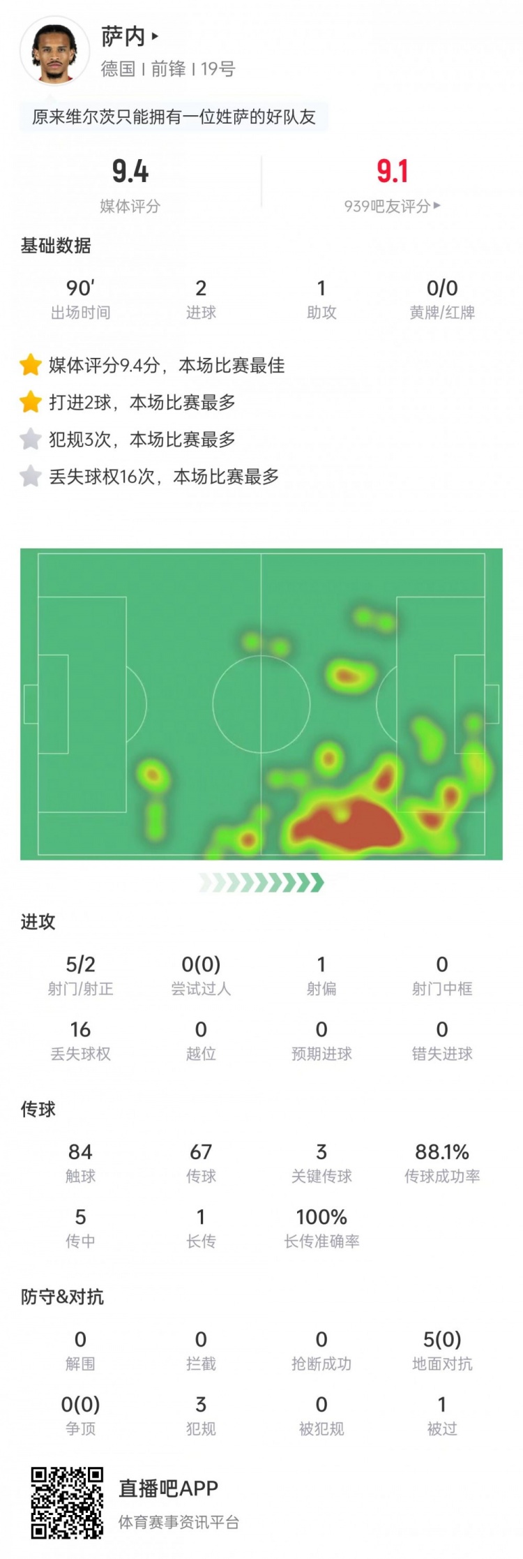 萨内本场数据:2球1助+3次要道传球,获评9.4分全场最高