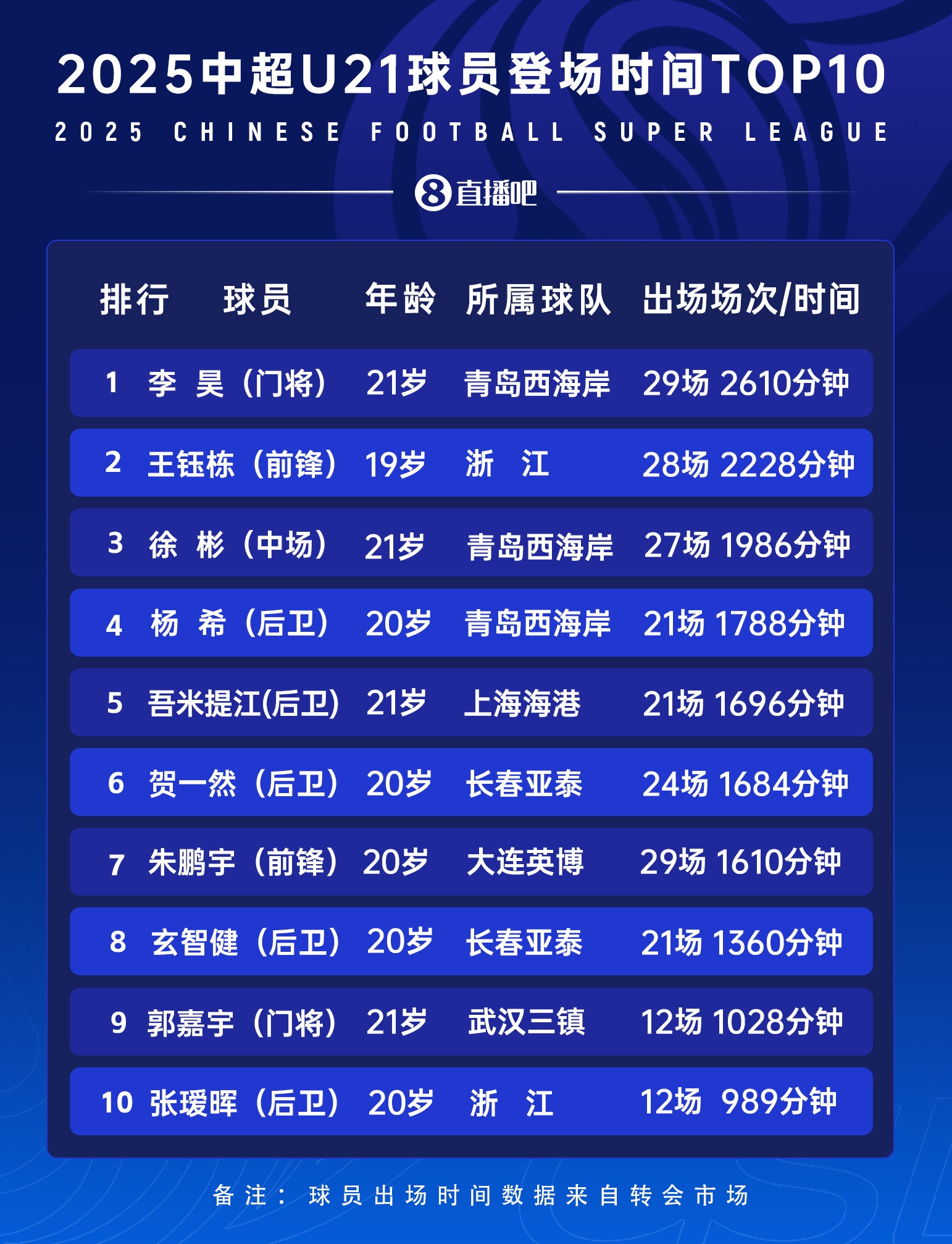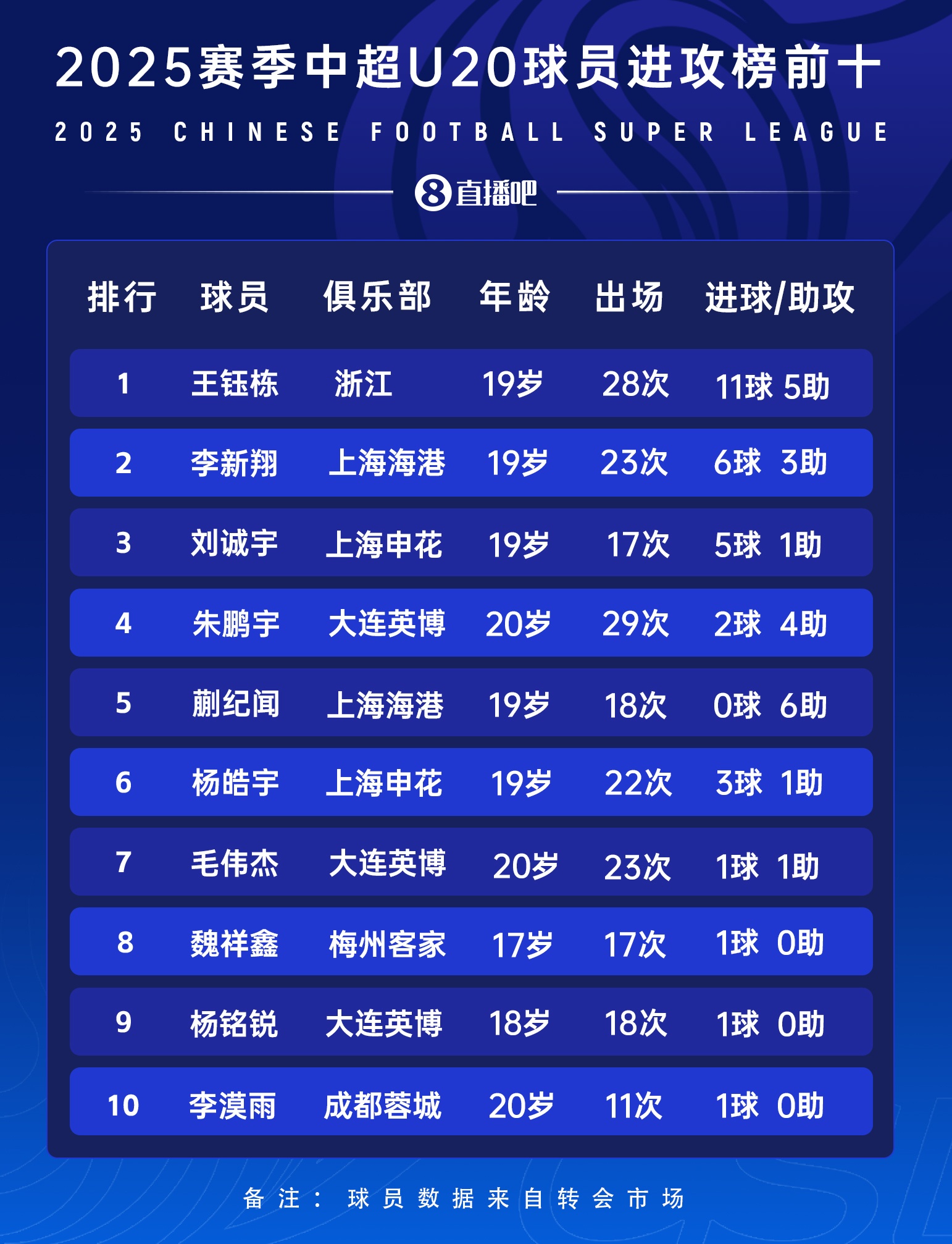 2025赛季中超联赛大幕落下,上海海港到手卫冕,梅州客家和长春亚泰降入中甲。在漫长的9个月征途中,外助撑起了各队的战术框架,原土中生代球员和宿将阐发着关节作用,在这两股力量的夹缝中,U20球员冗忙地寻找着飞腾旅途。在王钰栋、朱鹏宇、李新翔、徐彬和魏祥鑫等东谈主的惊艳阐扬背后,更多初涉中超的小将还在为置身交替声威而拼搏。