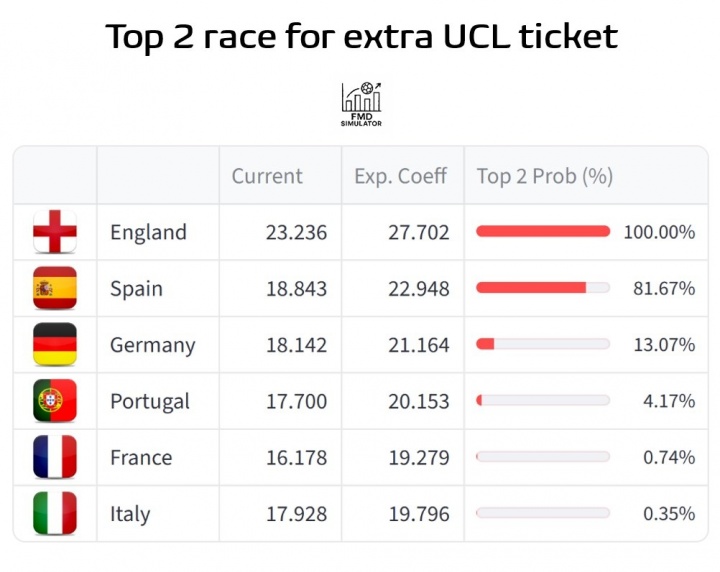 本赛季欧战系数平均积分前二下赛季将有一个额外欧冠名额,目前英超已锁定欧冠额外名额,而西甲则有超过八成的概率获得此名额。