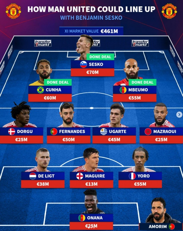 8月9日讯 曼联官方告示塞斯科加盟,德转也对新赛季曼联可能排出的首发声势进行瞻望,具体如下: