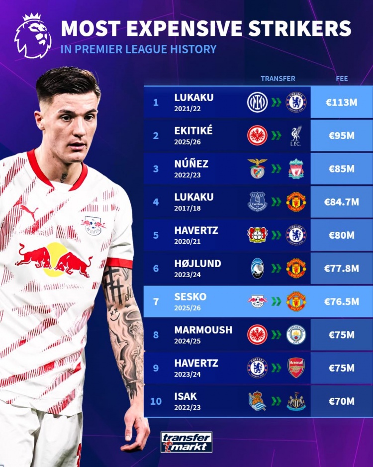 英超历史最贵先锋排名:卢卡库&哈弗茨梅开二度,前十曼联占三次