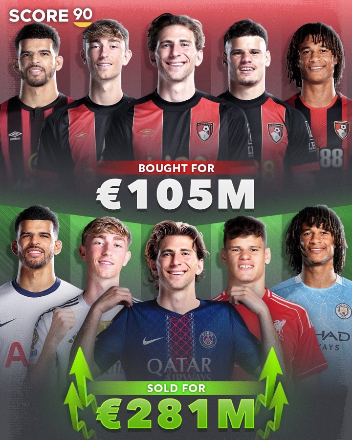 生财有说念💰伯恩茅斯队史卖东说念主前5总收入2.81亿 引进本钱仅1.05亿