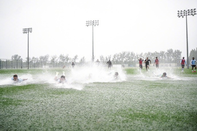 7月30日讯 申花官方晒照,球队在大雨中连接巡视。