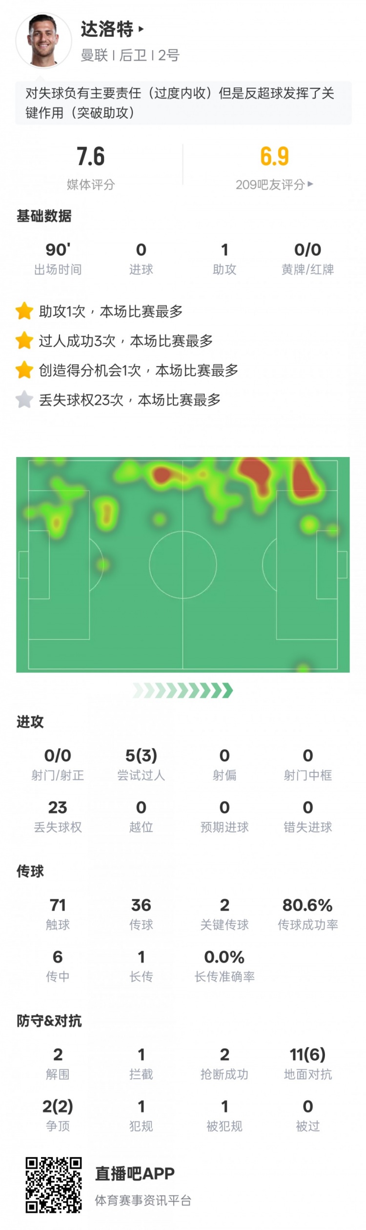 8月31日讯 2025-26赛季英超第3轮,曼联3-2险胜伯恩利。达洛特本场首发出战,孝敬1次助攻,送出2次要害传球,还有3次过东谈主到手以及2突围2抢断,但也有全场最多的23次丢失球权,评分7.6。