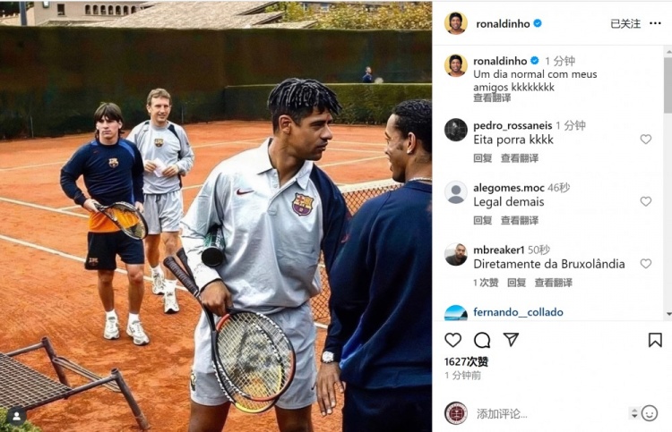 罗纳尔迪尼奥社媒晒出遵守巴萨技能与里杰卡尔德、梅西、罗卡(助教)一齐打网球的相片,配文:“与一又友们渡过的平日一天,哈哈哈。”