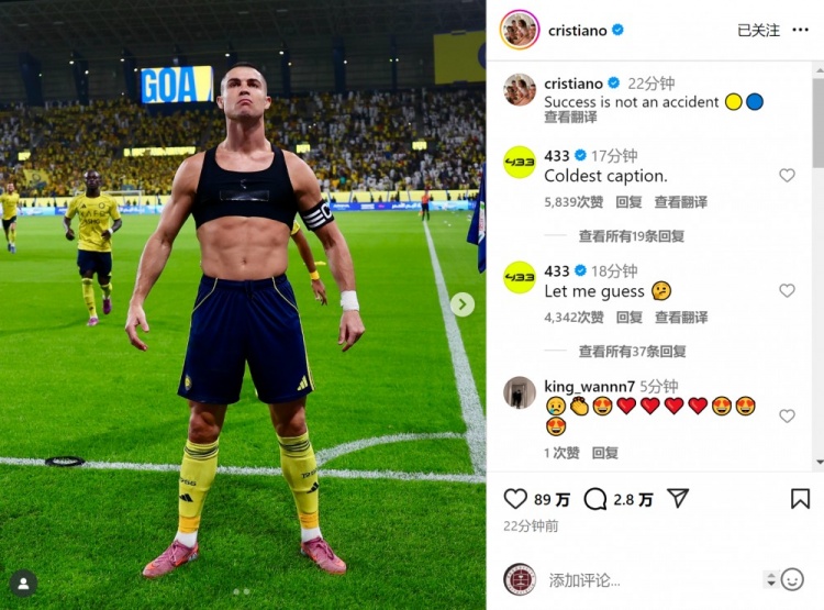 此役C罗传射立功,匡助利雅得顺利取胜,赛后他在莽撞媒体上晒出像片,配文:“顺利绝非或然。”
