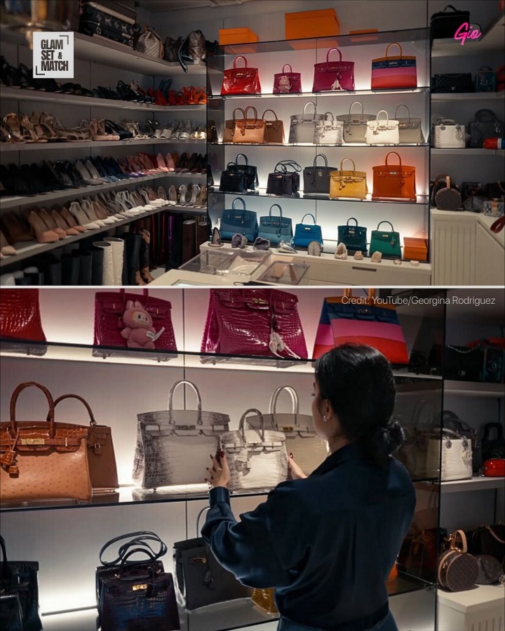 该衣帽间位于乔治娜在马德里的豪华公寓内,该衣帽间藏罕有不清的名牌鞋子和包包,其中最值钱的是中间的22个爱马仕铂金包系列。