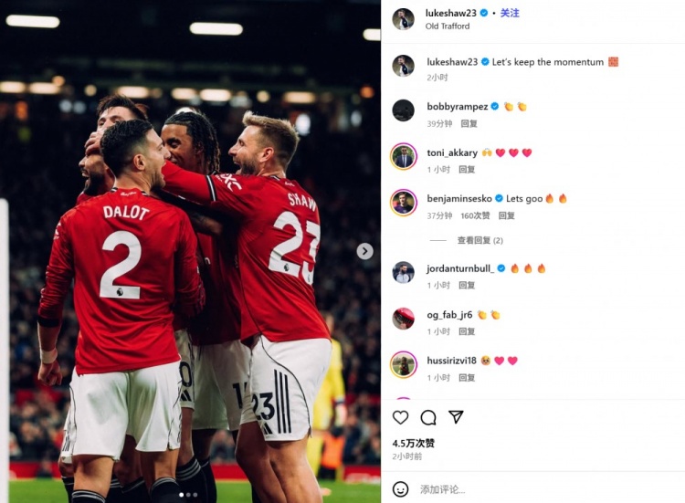 卢克-肖也在赛后通过社媒晒出和队友的相拥庆祝照,并配文:“让咱们陆续现时的势头!”