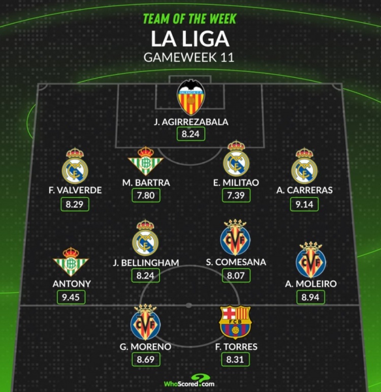 西甲本周最好气势公布:安东尼以9.45高分领衔,皇马4将入选