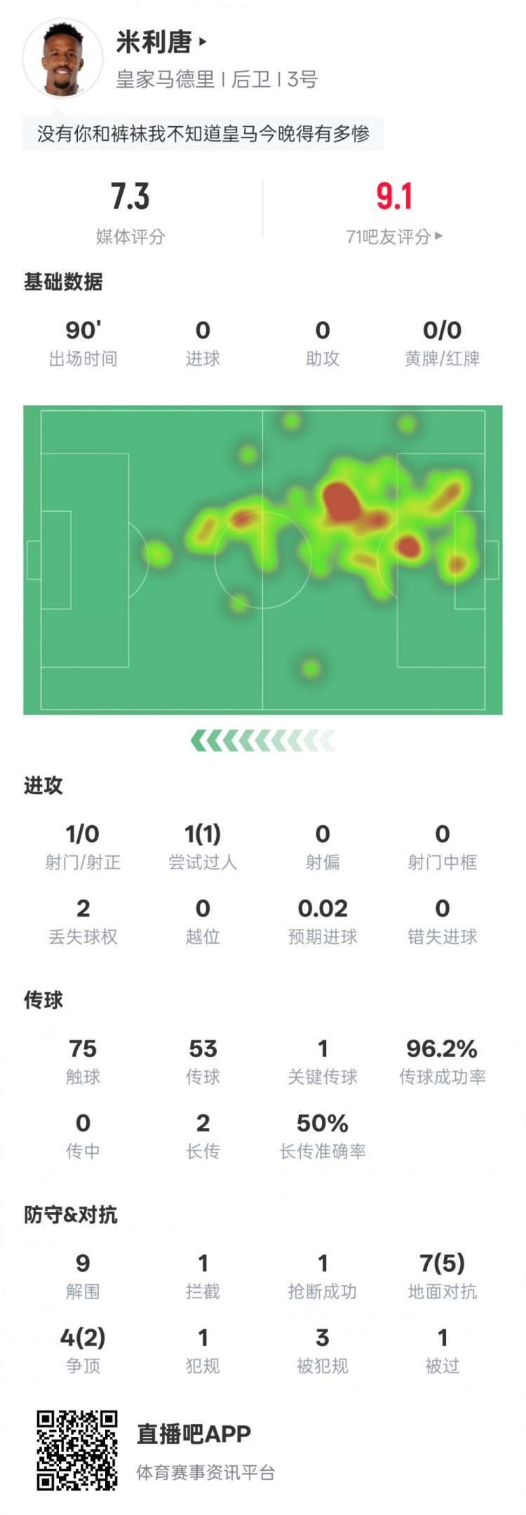 米利唐本场数据:1要道传球9突围+传球收效用96.2%,评分7.3
