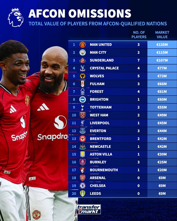 英超各队非洲杯球员身价榜:曼联、曼城前二位,枪手蓝军无东谈主参赛