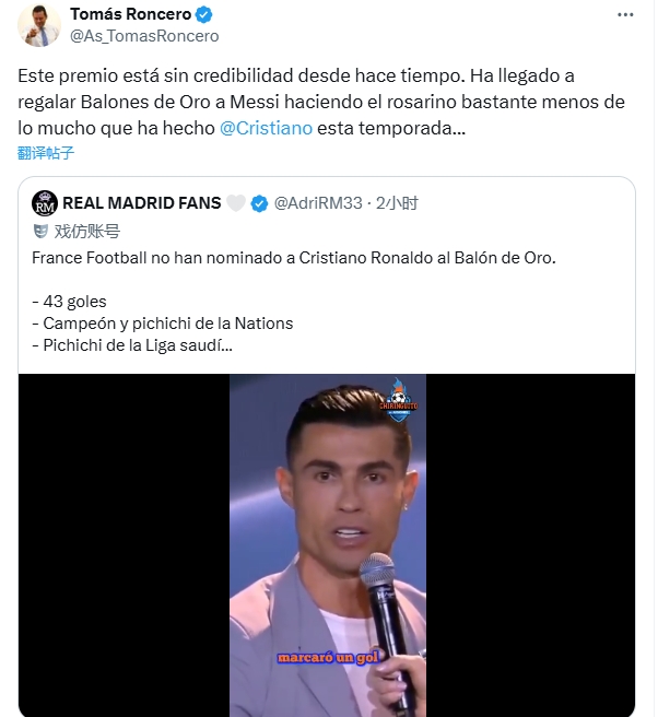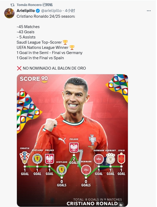 皇马球迷号:“法国足球莫得将C摆列入金球奖候选名单中,他打进了43球,是欧国联冠军和金靴、沙特联金靴、在欧国联决赛进球,这一切皆是在他40岁时作念到的。”