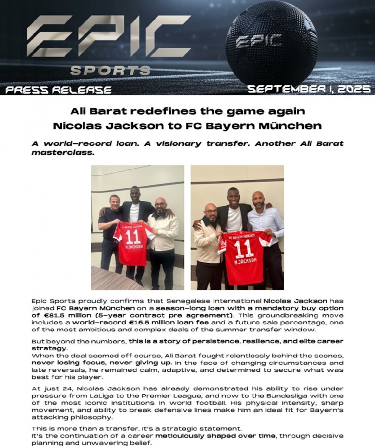 “Epic Sports自傲地告示,塞内加尔国脚尼古拉斯-杰克逊已加盟拜仁慕尼黑,式样为为期一年的租出,附带强制买断条件,总价为8150万欧元(公约包含5年合同预签)。”