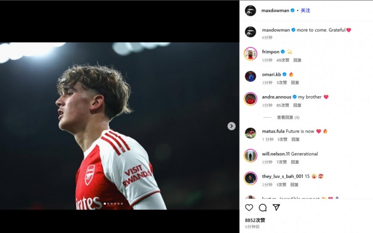 他也以15岁302天成为阿森纳队史最年青首发,谈曼也在赛后通过社媒晒出我方的比赛照并顾虑谈:“期待更多,感德!”