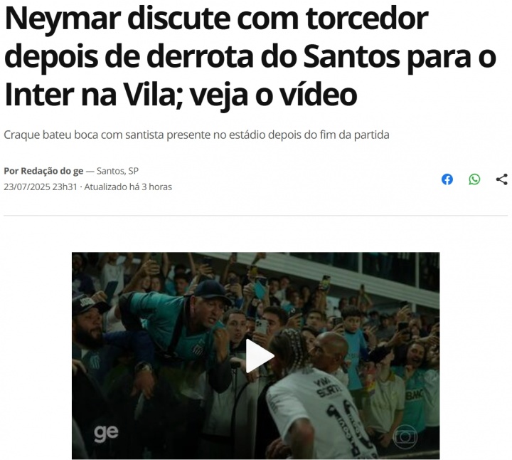 巴媒:桑托斯输球后,内马尔与别称看台上的球迷发生强烈争抓