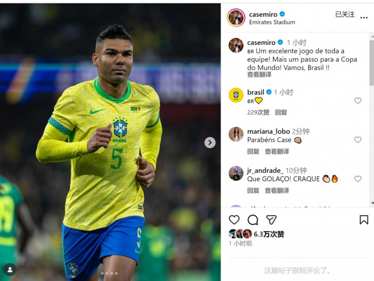 卡塞米罗社媒晒出比赛像片,写谈:“全队王人剖析出色,向寰宇杯又迈进一步!加油巴西!”