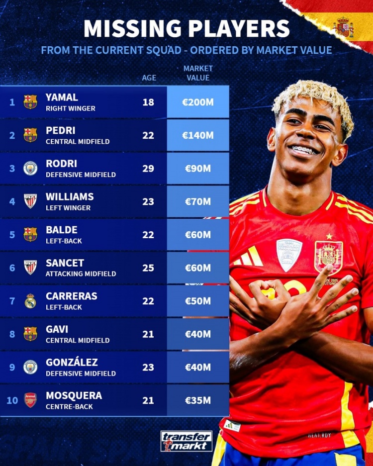 11月16日讯 德国转会市集统计了无缘本期西班牙队球员身价,比肩出榜单,亚马尔2亿欧居首。
