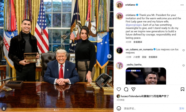 C罗社媒致谢:感谢总统先生的邀请,以及对我和我光棍妻的接待