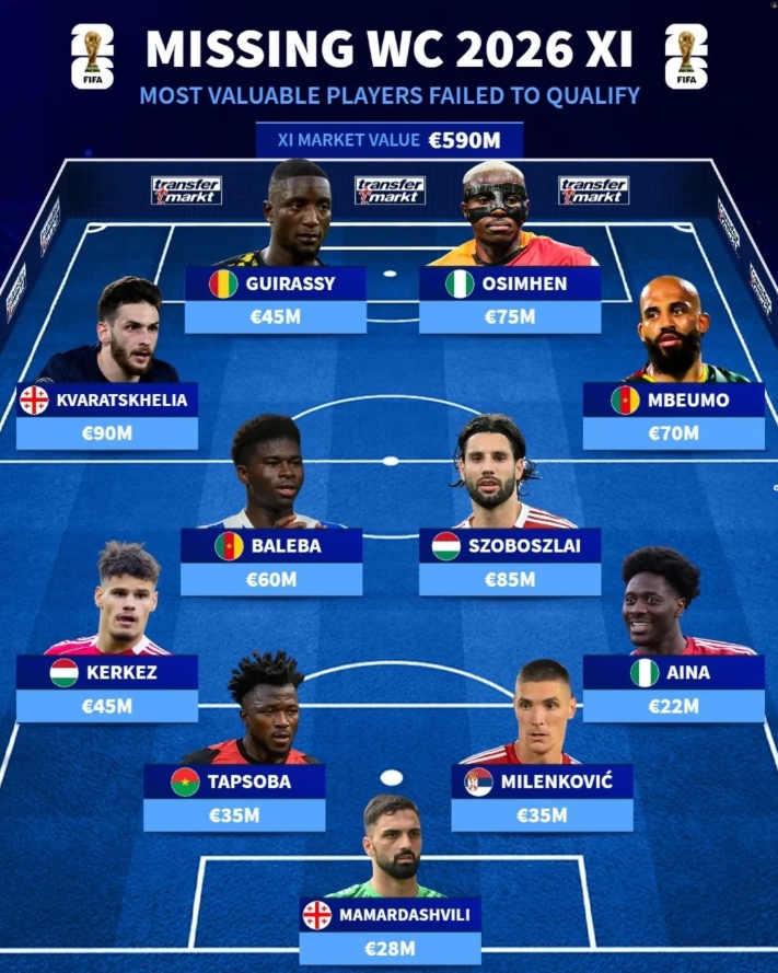 当天德转社媒晒图,列出无缘2026寰球杯球员中身价最高的首发声势,奥斯梅恩、姆伯莫、K77、索博斯洛伊等多名球星在列。