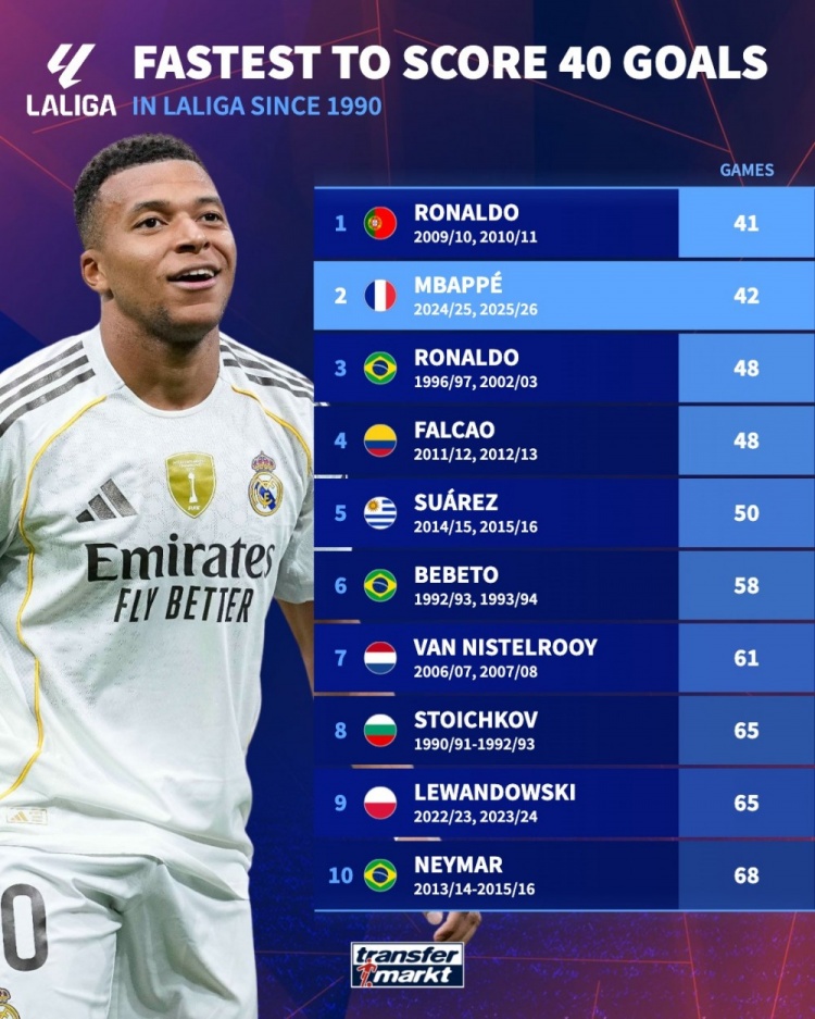 1990年以来最快实现西甲40球名次:C罗41场居首,姆巴佩42场次席