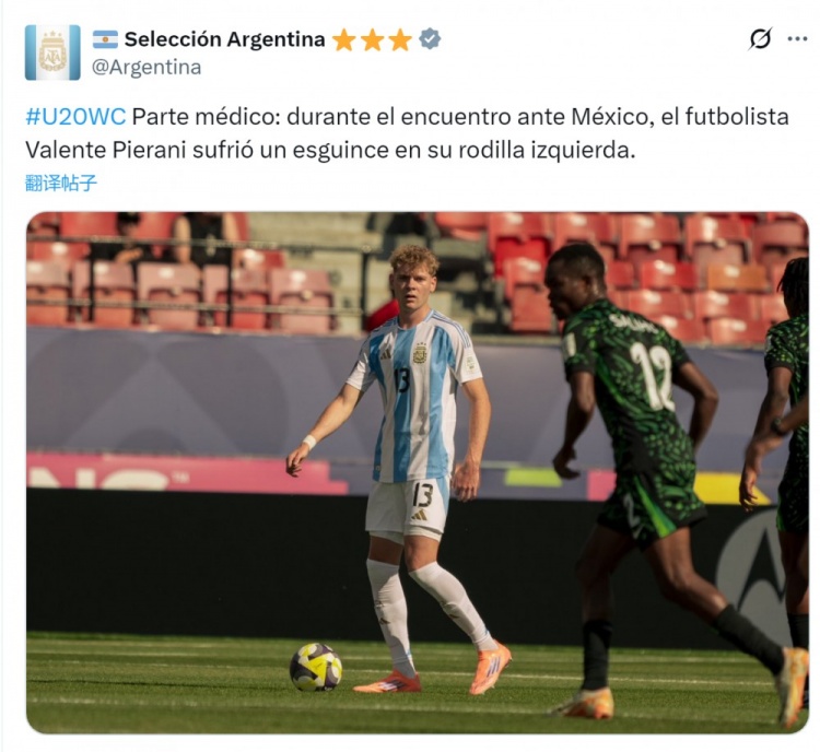 官方:阿根廷U20主力中卫皮埃拉尼左膝扭伤,此前连合4场首发