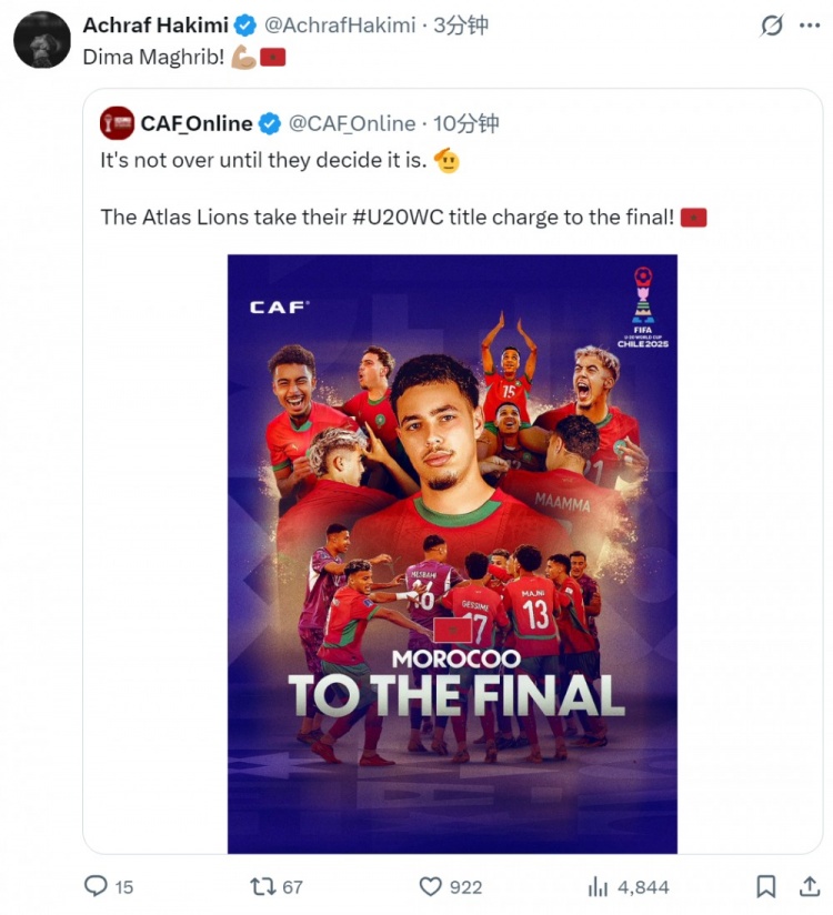 摩洛哥插足世青赛决赛,阿什拉夫转发海报道贺:摩洛哥加油