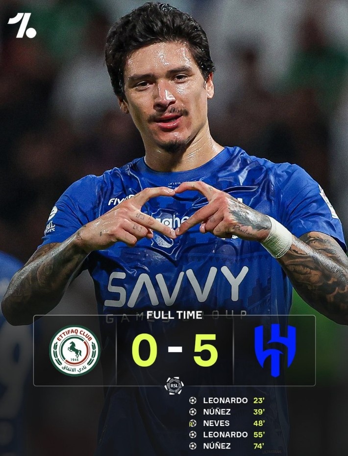 沙特联利雅得眉月5-0大捷达曼互助,努涅斯、莱昂纳多梅开二度