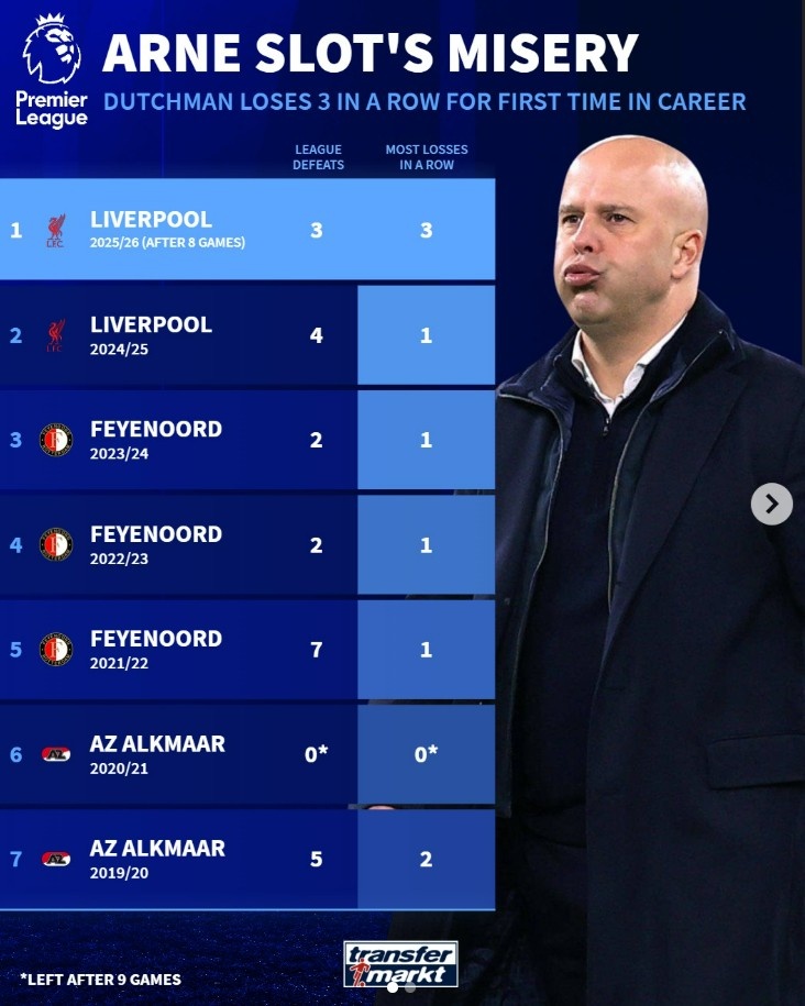 斯洛特捏教生活初度遭受联赛3连败,此前5个赛季均未出现连败