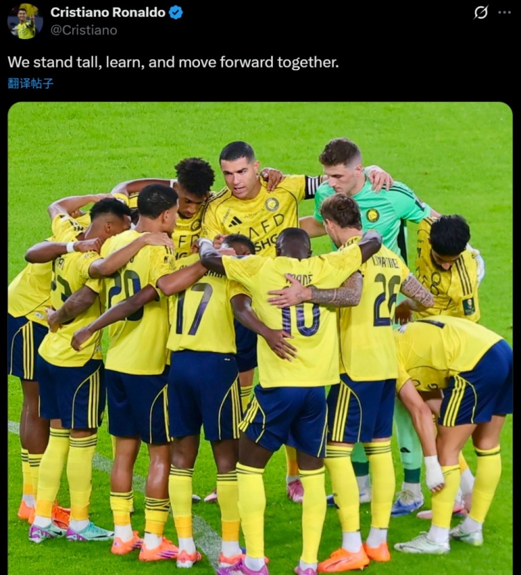 C罗在赛后通过社媒晒出全队围成一圈时我方的喊话照,并配文:“咱们抬头挺胸,扫数学习何况不绝上前。”