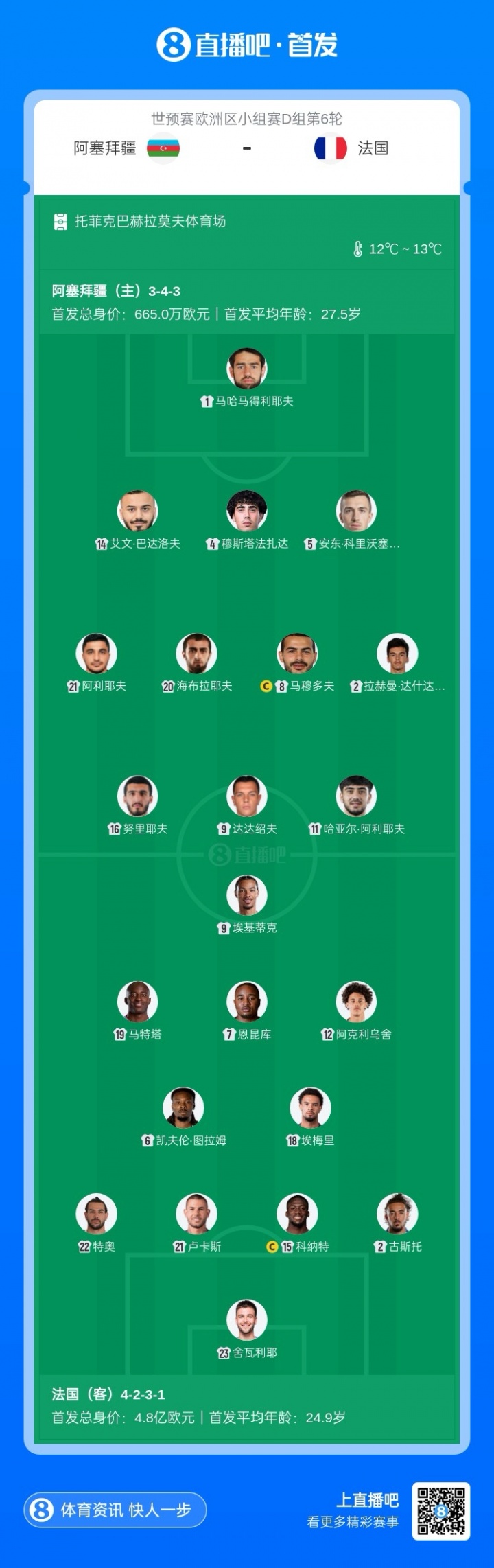 法国vs阿塞拜疆首发:姆巴佩缺阵,埃基蒂克、恩昆库、科纳特先发