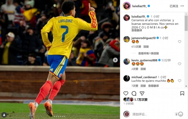 迪亚斯社媒晒出庆祝进球的相片,配文:“咱们以得胜和奥密的嗅觉为2025年收官,2026年见,哥伦比亚球迷们!”