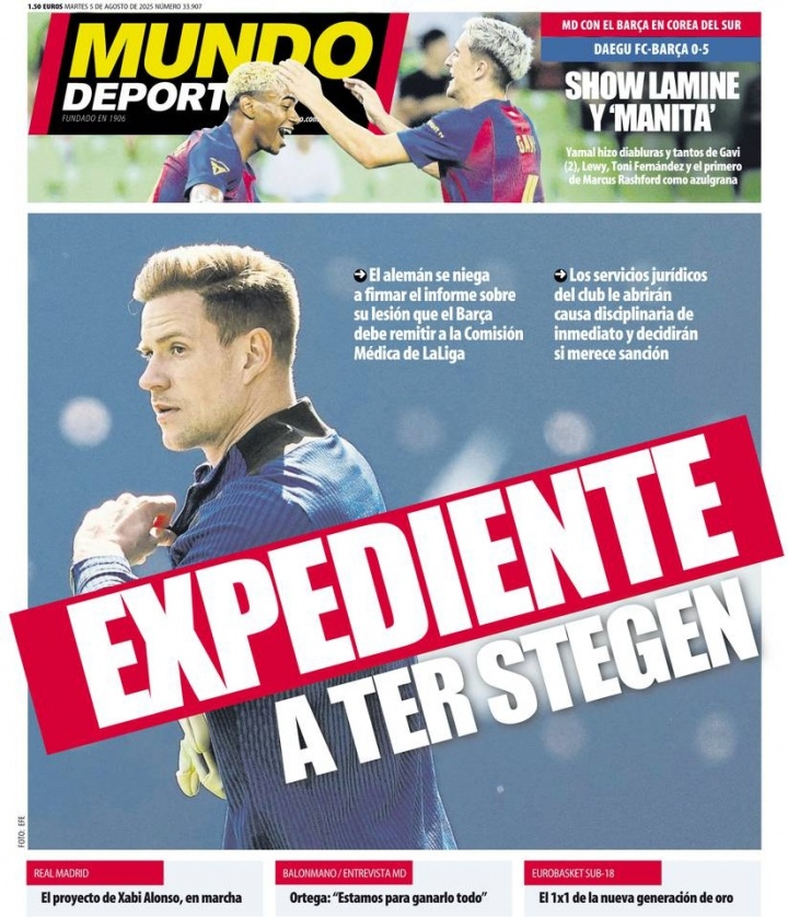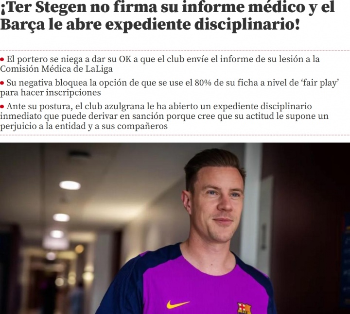 特尔施特根上个月完成了腰部手术,瞻望遥远伤缺。据特尔施特根的老友东说念主士走漏,他拒却签署医疗开心书,这么一来巴萨无法将伤情论述提交给西甲医疗委员会,以评估其伤势的严重进度。