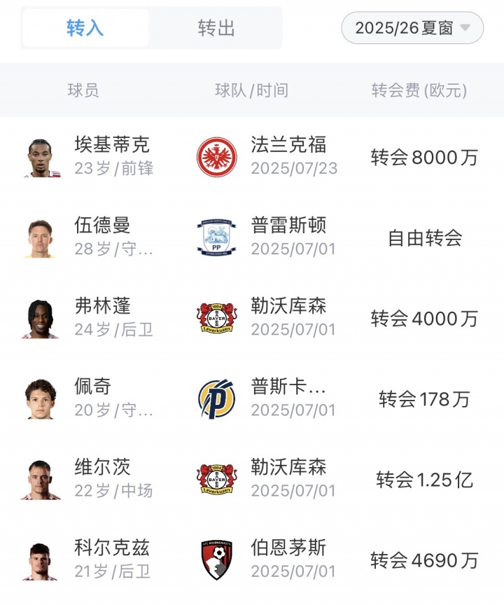 今夏利物浦一反常态,消耗2.9368亿欧引入6东说念主,其中包括1.25亿欧签维尔茨,以及从伯恩茅斯引进科尔克兹。
