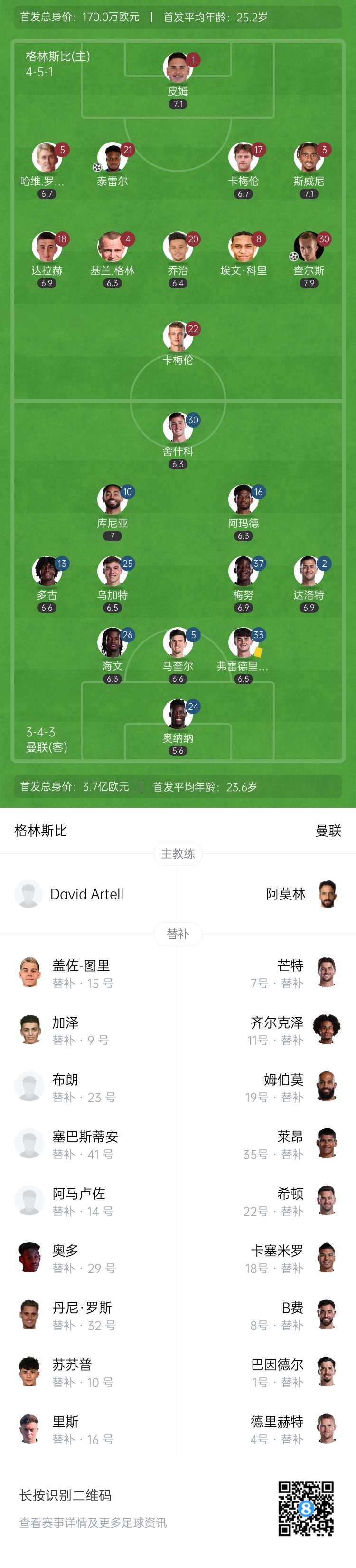 第30分钟,格林斯比左侧角球契机,传中到禁区中,奥纳纳出击虚伪,沃伦将球打进佛门!曼联0-2逾期格林斯比↓