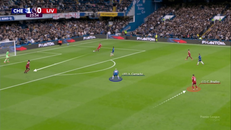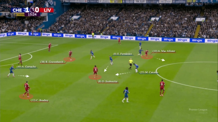 不外切尔西一役也阐明斯洛特并非不会变通:把索博斯洛伊挪到右后卫,换上琼斯和维尔茨这两个“跑不死”,立马打出精妙合营——琼斯开脱恩佐接赫拉芬贝赫传球,维尔茨和索博斯洛伊的站位牵制住库库雷利亚与凯塞多,为琼斯直塞萨拉赫创造了内切传中的空间: