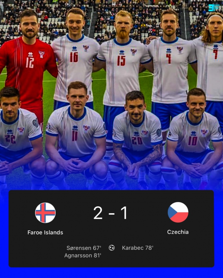 世初赛欧洲区小组赛,全国排行第136的法罗群岛在主场以2-1的比分爆冷校服全国第39的捷克。