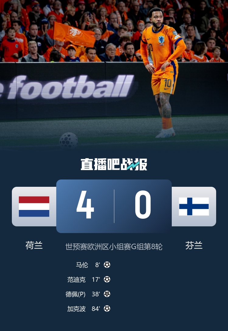 德佩点射+助攻双响,马伦全国波,范迪克、加克波立功;荷兰6轮不败领跑G组。