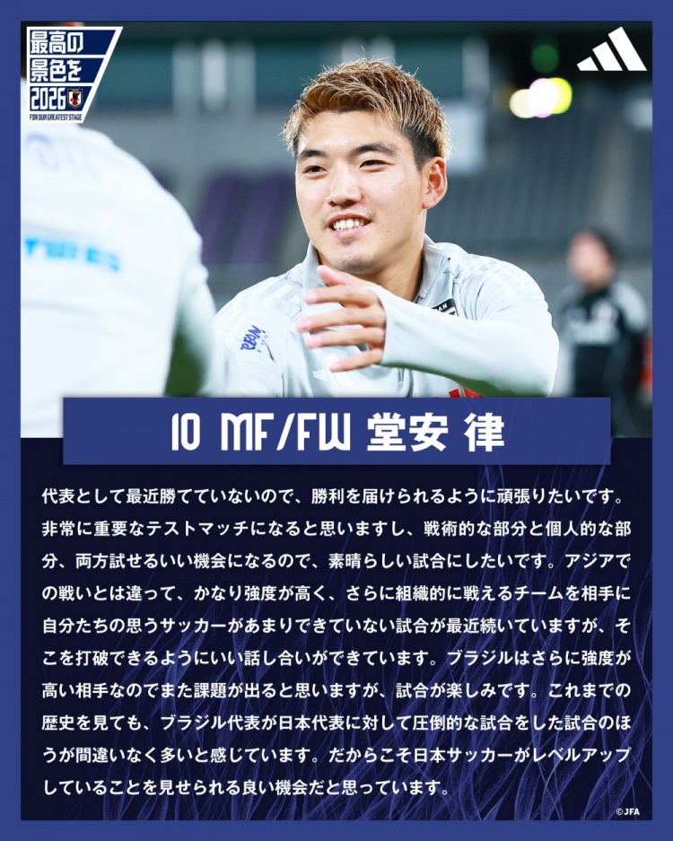 堂安律:战巴西队是历练实力的良机 要通过比赛诠释日本足球的提高