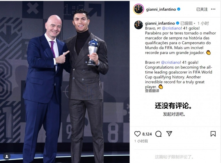 C罗业绩生活于今世初赛打进41球,独享世初赛历史弓手王荣誉,外洋足联主席因凡蒂诺社媒晒出与C罗的合照,对他示意道喜。