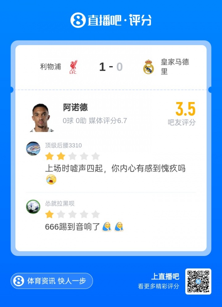 本场比赛,训诫于利物浦青训,今夏加盟皇马的阿诺德于第81分钟替补登场,但并未变调比赛走势,范戴克指点的利物浦最终还是在主场获得特脱手。