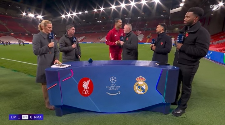 赛后,利物浦队长范戴克在场边秉承了媒体TNT的瞬采,与鲁尼、沃尔科出奇辩驳员聊了须臾。