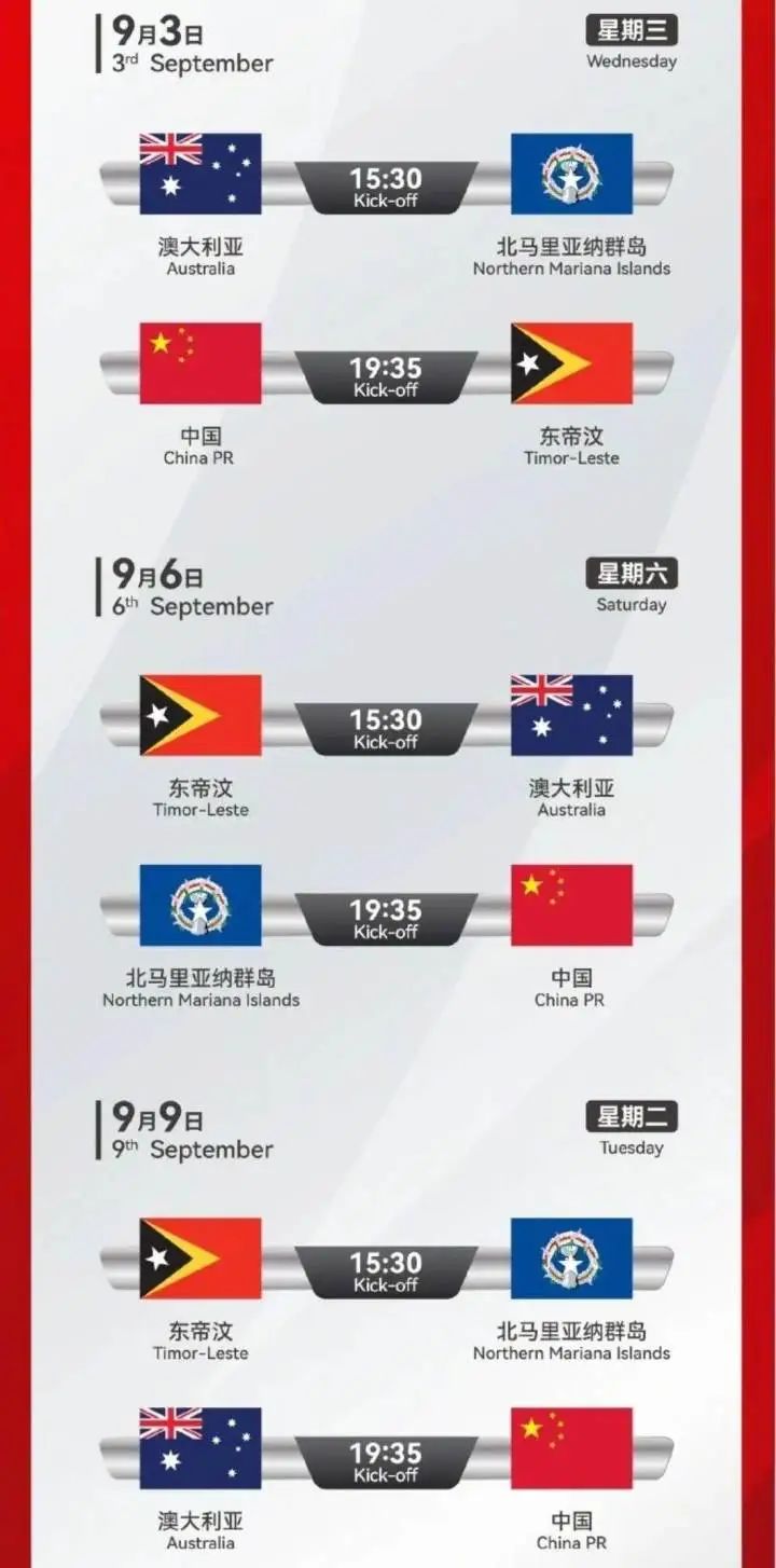 预选赛的抽签恶果此前仍是出炉,中国队与澳大利亚、东帝汶和北马里亚纳群岛同处D组,比赛将于9月3日至9月9日在西安进行,具体赛程如下: